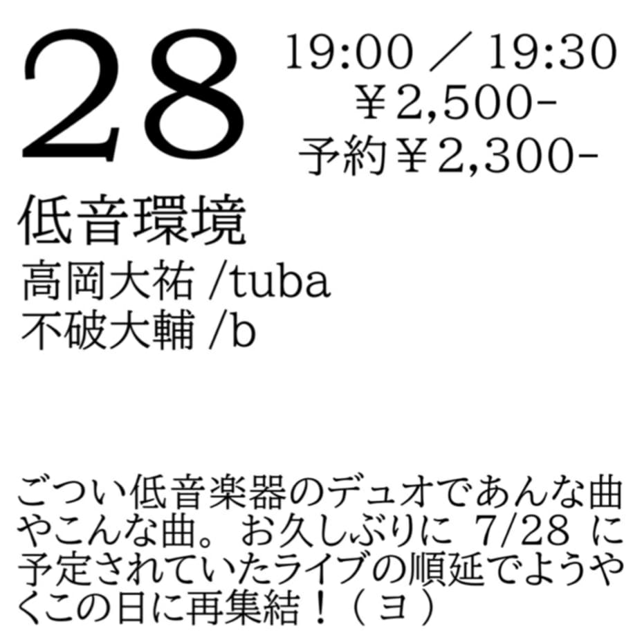 ごつい低音楽器のデュオであんな曲やこんな曲。お久しぶりに7/28に予定されていたライブの順延でようやくこの日に再集結!(ヨ)