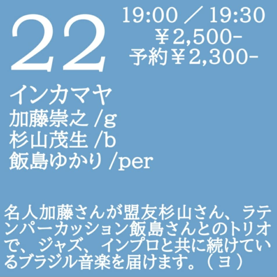名人加藤さんが盟友杉山さん、ラテンパーカッション飯島さんとのトリオで、ジャズ、インプロと共に続けているブラジル音楽を届けます。(ヨ)
