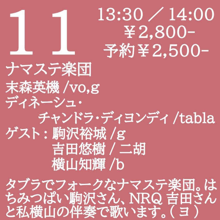 タブラでフォークなナマステ楽団。はちみつぱい駒沢さん、NRQ吉田さんと私横山の伴奏で歌います。(ヨ)