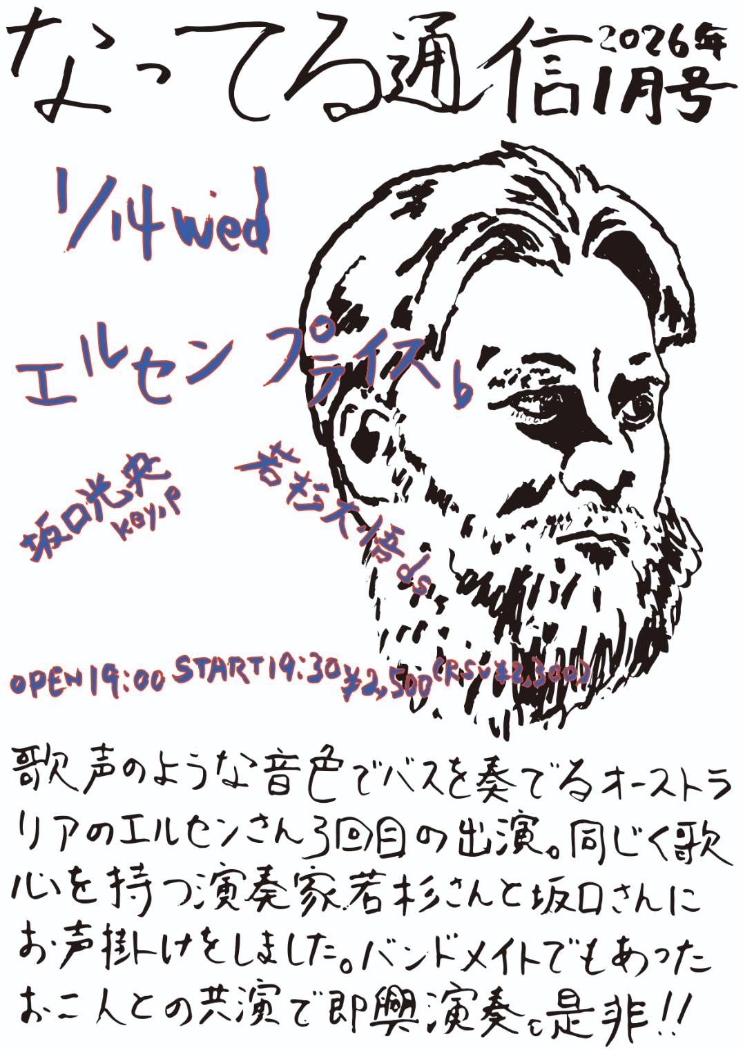 オーストラリアの豊かな音色のエルセンさん再来日。久々に共演の盟友坂口さんと若杉さんのおふたりとトリオで即興演奏です。(ヨ)